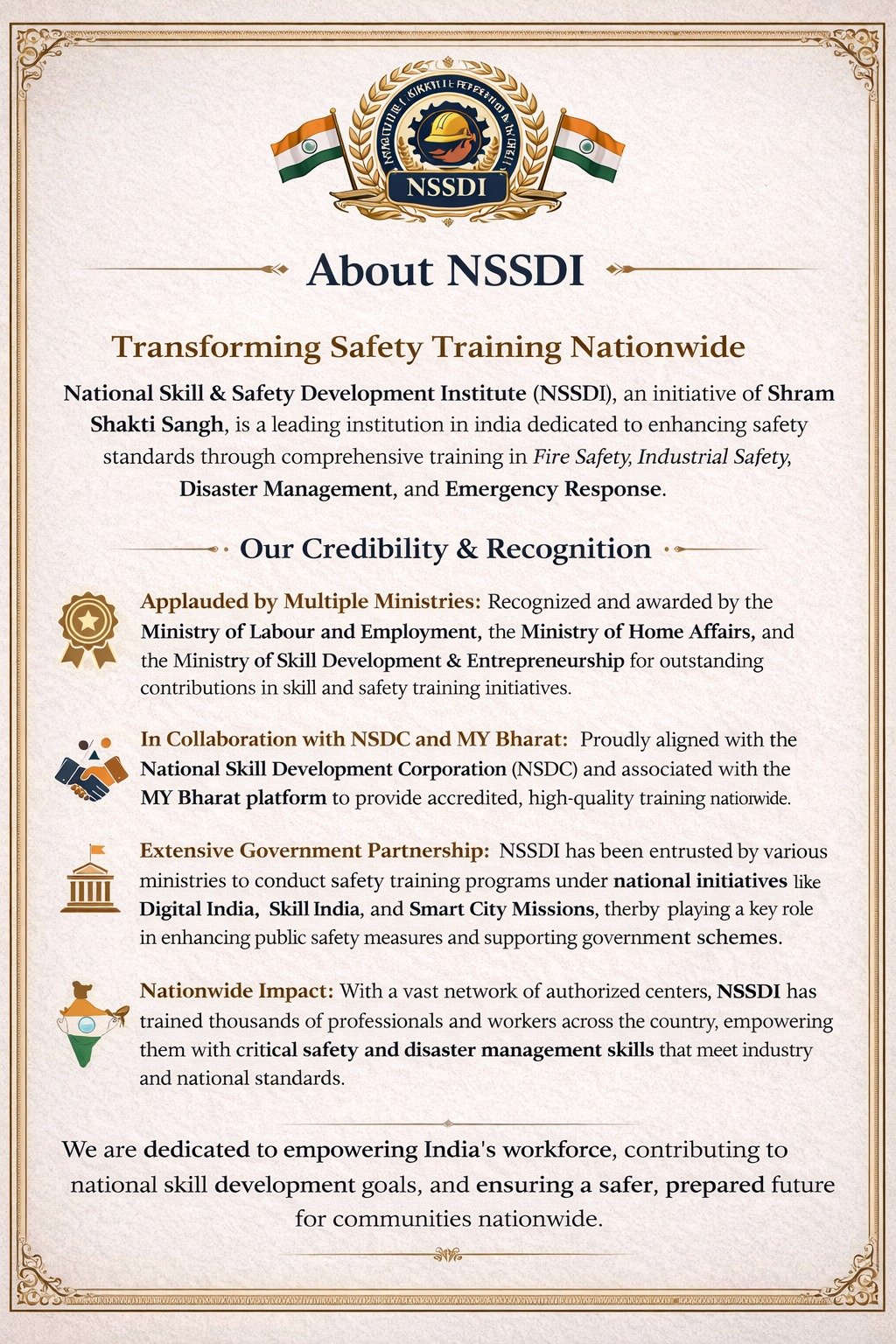 NSSDI aims to bridge the gap between skill development and safety awareness, contributing towards a safer and stronger India.